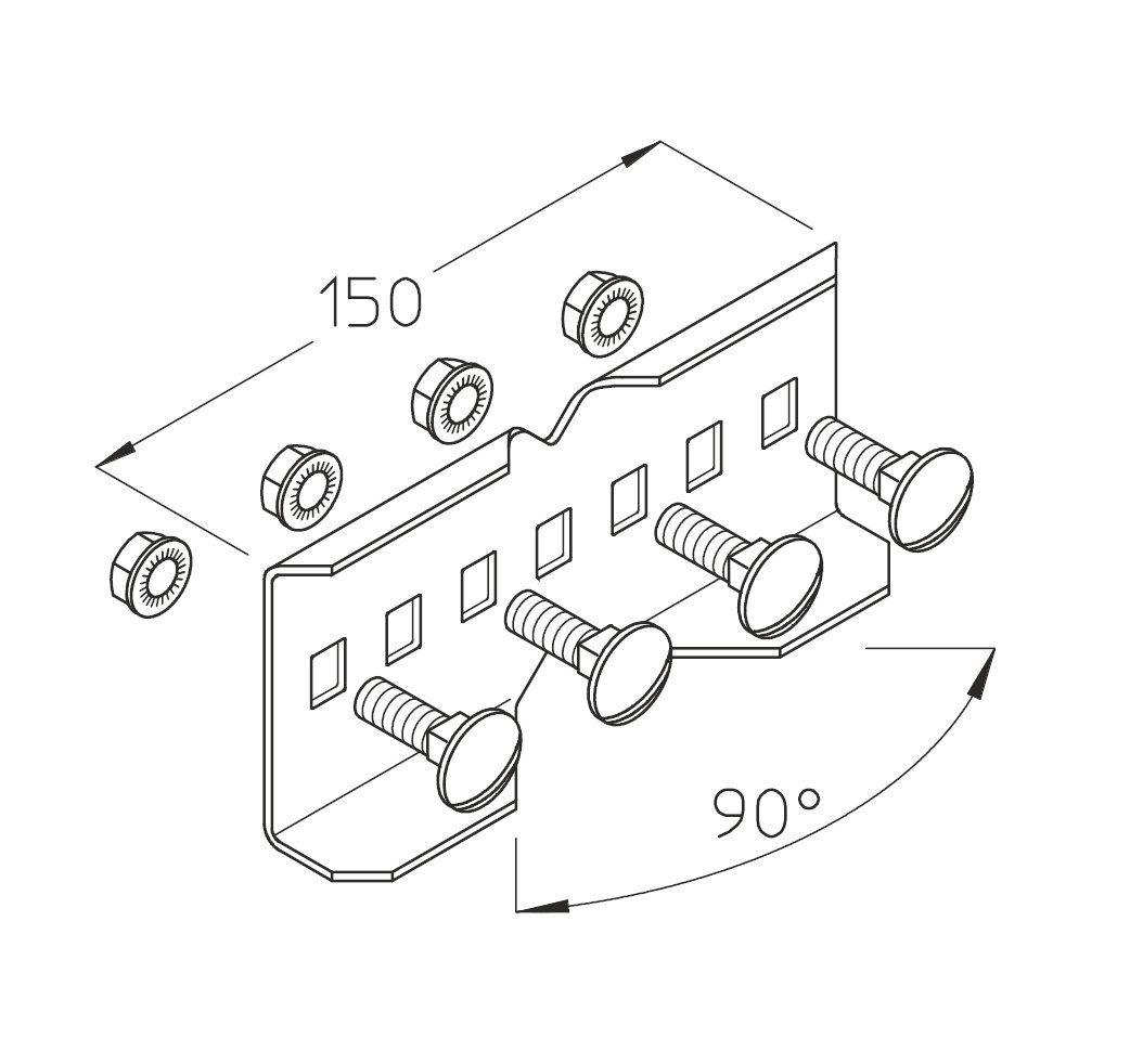Łącznik poziomy drabinki kablowej, umożliwiający zmianę przebiegu kierunku trasy kablowej. Stosowanie łącznika zapewnia utrzymanie ciągłość potencjału zgodnie z DIN EN 61537. Produkt dostępny jest również w wykonaniu ze stali kwasoodpornej, materiał 1.4571 / 1.4404 (V4A).