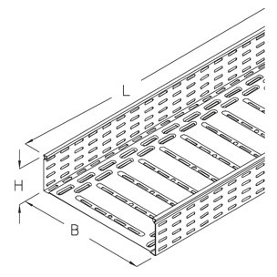 Cable tray perforated, head shape suitable for positive locking covers, with longitudinal and lateral reinforcing rims reducing bottom deflection, certified including electrical conductivity according to DIN EN 61537
