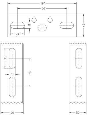 Ceiling bracket support, U-profile 40x30x2 mm, continuously three-way perforated, with welded head plate (material thickness t), certified according to DIN EN 61537.