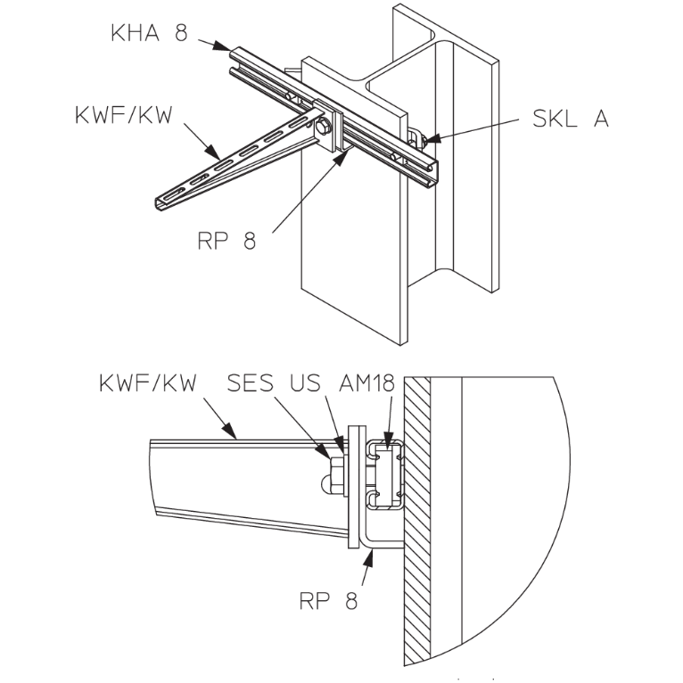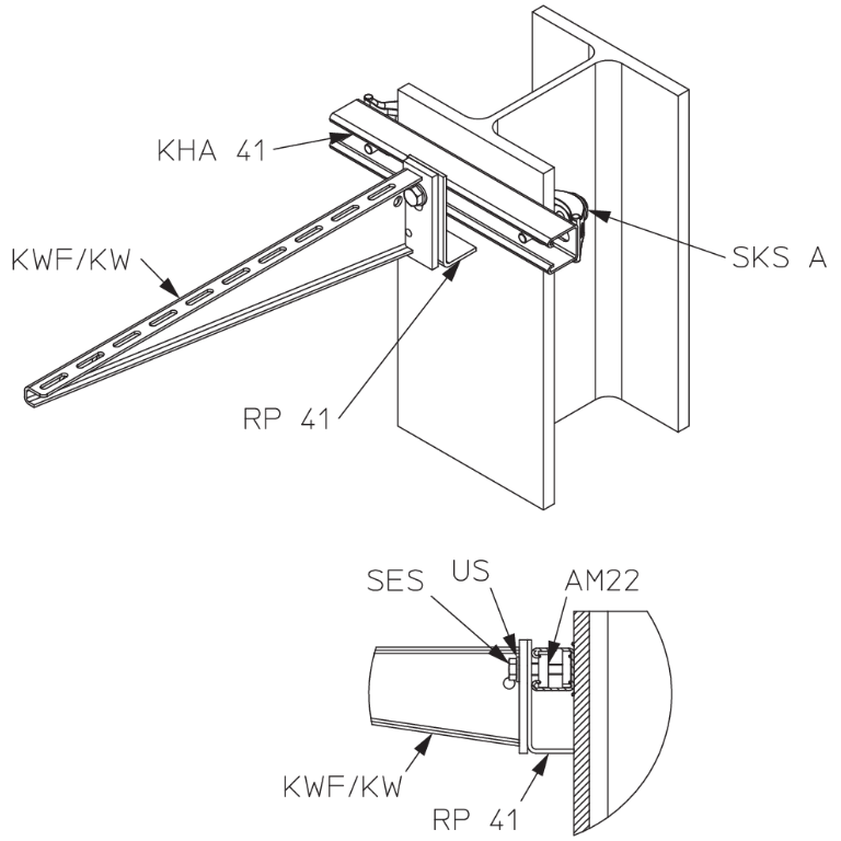 Kątownik dystansujący RP przeznaczony jest do wsporników poziomych KWF lub KW, które mocowane są do profili stalowych za pomocą poziomych kształtowników KHA 8 lub KHA 41. Kątownik dystansujący umieszczony pomiędzy wspornikiem a kształtownikiem zapobiega występowaniu sił skręcających na poziomym kształtowniku. Kątownik dystansujący RP 8 przeznaczony jest do kształtowników KHA 8, RP 41 do kształtowników KHA 41.