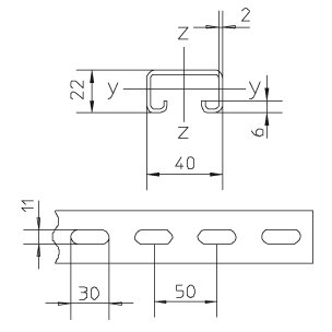 Profile rail 40x22x2.00 mm, with continuous perforation 11x30, slot size 18 mm