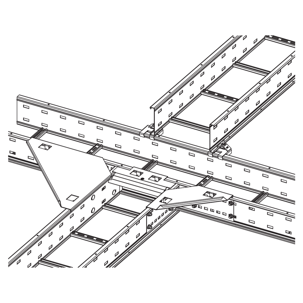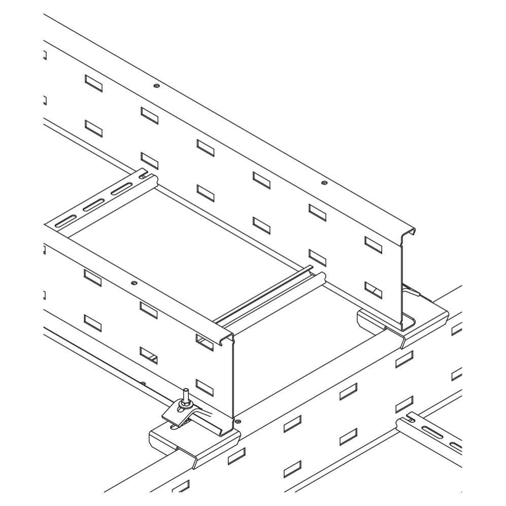 Łącznik górny drabinki / korytka samonośnego umożliwia połączeni dwóch drabinek / korytek kablowych samonośnych z przesunięciem poziomów. Łącznik pozwala na wykonanie odejścia bocznego lub skrzyżowania bez konieczności wycinania burt bocznych w drabince / korytku. Drabinka / korytko montowane jest za pomocą załączonych w komplecie łap mocujących SKLL oraz FRS, US i SEM.
