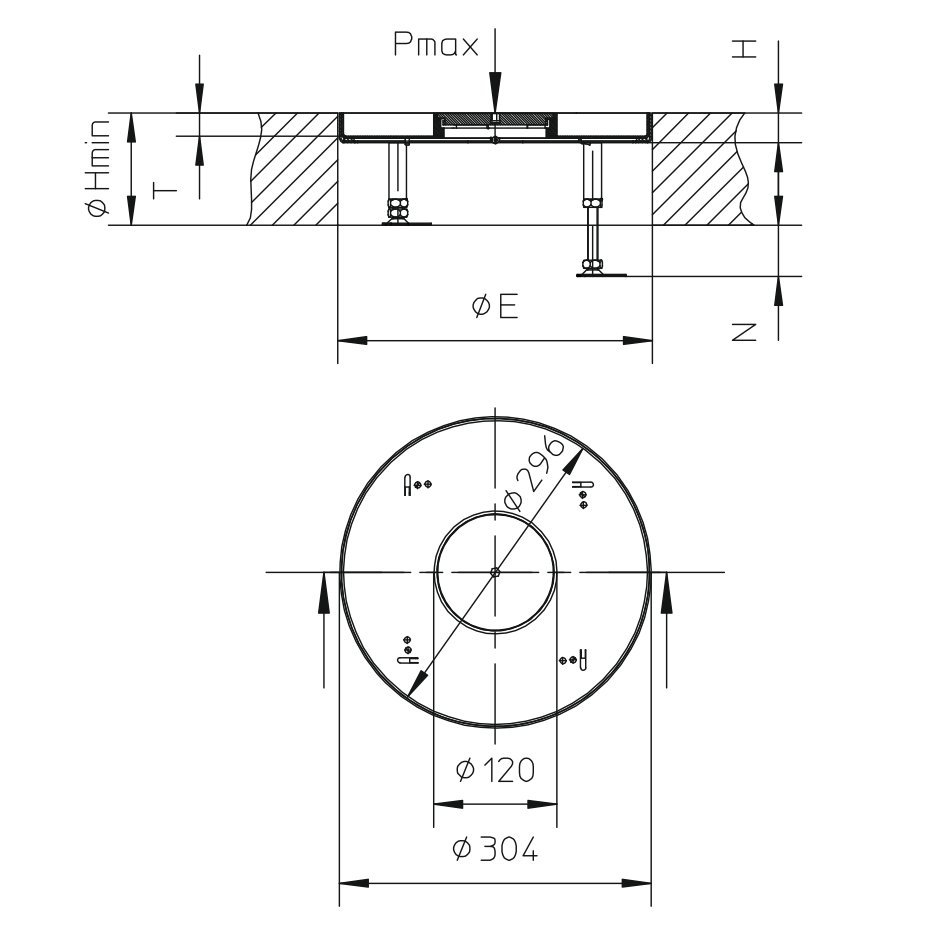 Kaseta ślepa z tubusem wylotowym, okrągła, poziomowalna.